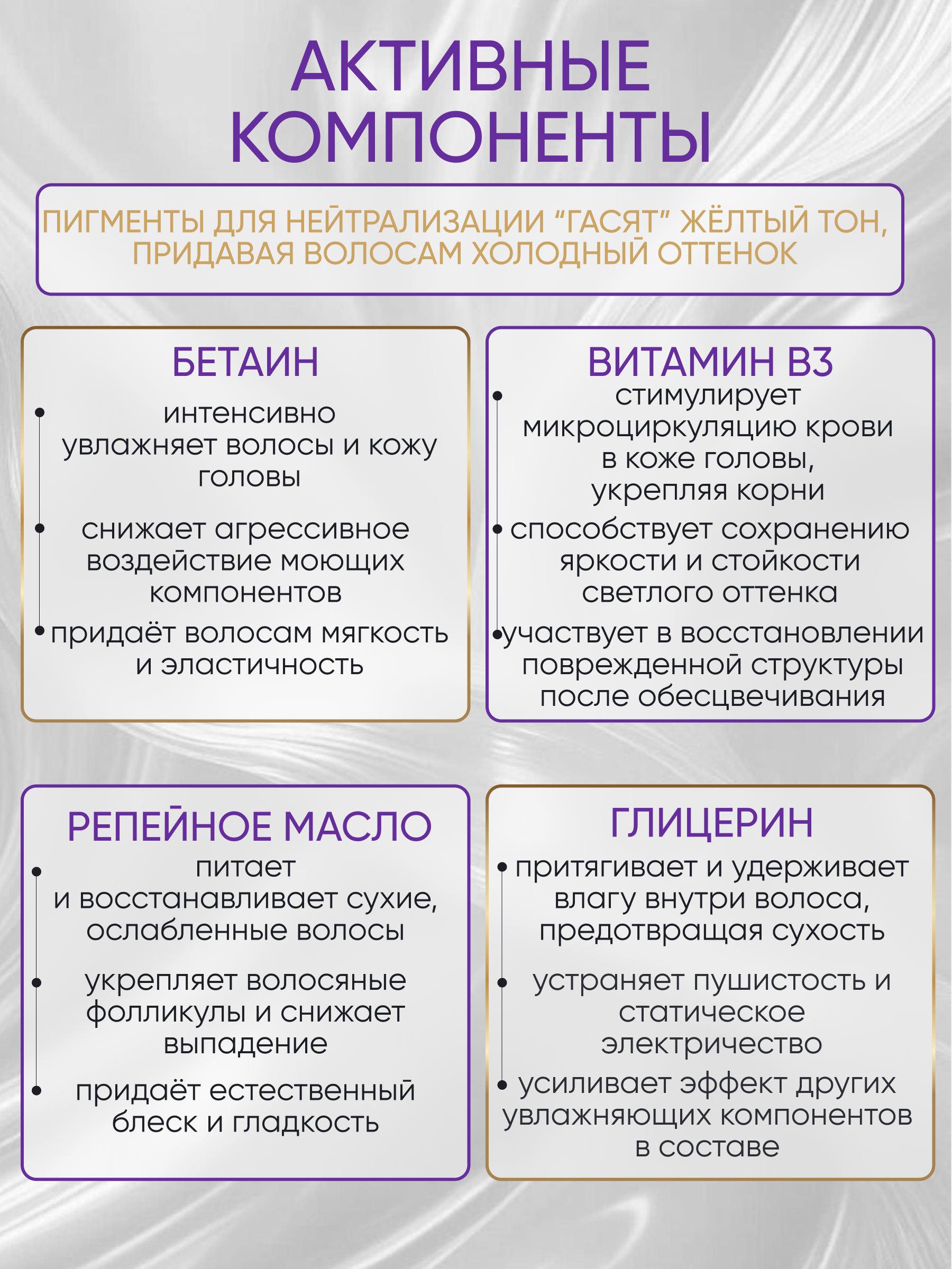 Содержит в своем составе глицерин, бетаин, Витамин B3. Фиолетовый шампунь нейтрализует нежелательные оттенки блонда, тонирует осветленные и мелированные пряди. Восстанавливает природный водный баланс волос, борясь с их сухостью и ломкостью. Витамин B3 улучшает кровообращение кожи головы, способствуя росту и объему волос. Репейное масло обеспечивает корням волос полноценное питание, предупреждает сечение кончиков. Аромат: Древесно-цветочный, свежий.