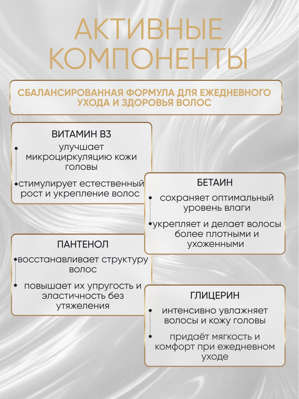 Шампунь содержит в своем составе бетаин, глицерин, пантенол и Витамин B3. Глицерин устраняет сухость, борется с перхотью, делает волосы мягкими и послушными. Пантенол восстанавливает и увлажняет волосы, задерживает влагу внутри, стимулирует рост и повышает густоту. Бетаин и Витамин B3 укрепляют структуру волоса, препятствуя ломкости и спутыванию. Придают волосам блеск и эластичность. Аромат: Восточный, цветочно-древесный, мандарин, кардамон, розовый перец.